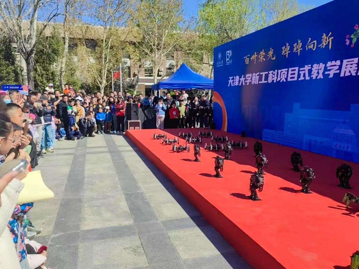 (meaning Tianjin University)” on the display board. The quadruped robotic dog equipped with an AI visual system became a popular star with its difficult moves like dancing and doing push-ups, vividly illustrating the cutting-edge development of embodied intelligence.