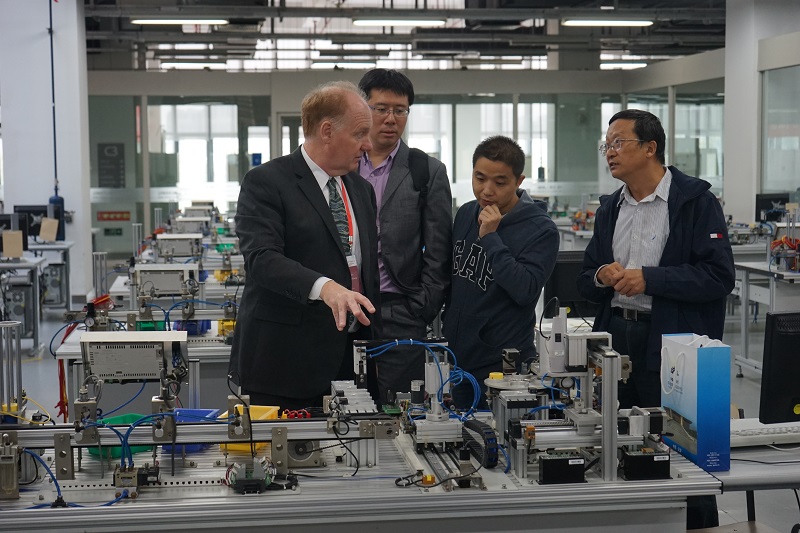 Anton Peter Jacob Middelberg专家接连走进现代控制技术实训中心、现代制造技术实训中心、现代物流领域实训中心、现代电子技术实训中心、信息技术实训中心,对实训中心的设备规模、服务功能、运行机制、培训模式等赞不绝口,并高度评价了学校对于学生专业实践能力培养的重视程度。