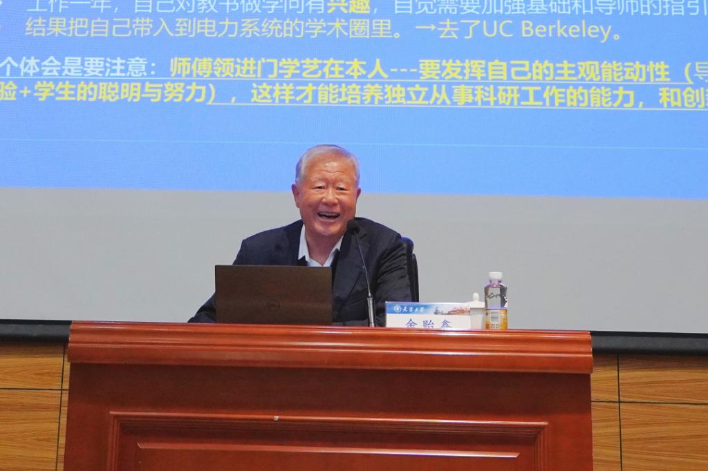 讲座在余院士个人求学经历的介绍中拉开序幕。作为新中国培养的第一个电力系统专业研究生,余院士结合自身经历,深入地与在场师生分享了自己的体会:“师傅领进门,学艺在本人——要发挥自己的主观能动性(导师的经验+学生的聪明与努力),这样才能培养独立从事科研工作的能力和创新思维。”余院士指出当前我们所处环境“机遇难得、责任重大”,鼓励同学们“应该对自己有较高要求,要抱定理想,执着追求”,同时要时刻牢记“科研要看真正的价值和‘Impact’”,要看“对技术进步、产业发展和社会生活究竟有多大的贡献”,并勉励大家 “攻博与攻硕(产生 New Idea)是个刻苦钻研的过程,功到自然成”。