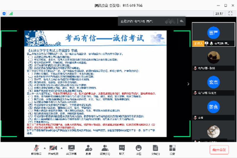 一直将“立德树人”作为学生培养的根本目标,致力于将学生培养成具有“天大品格”的新时代优秀青年。在考试周到来之际,各年级深入开展“感恩于心,诚信于行,励志于己”线上主题班会,各班学习了关于电信诈骗、校园贷、个人征信、诚信考试、感恩奉献几个方面知识。