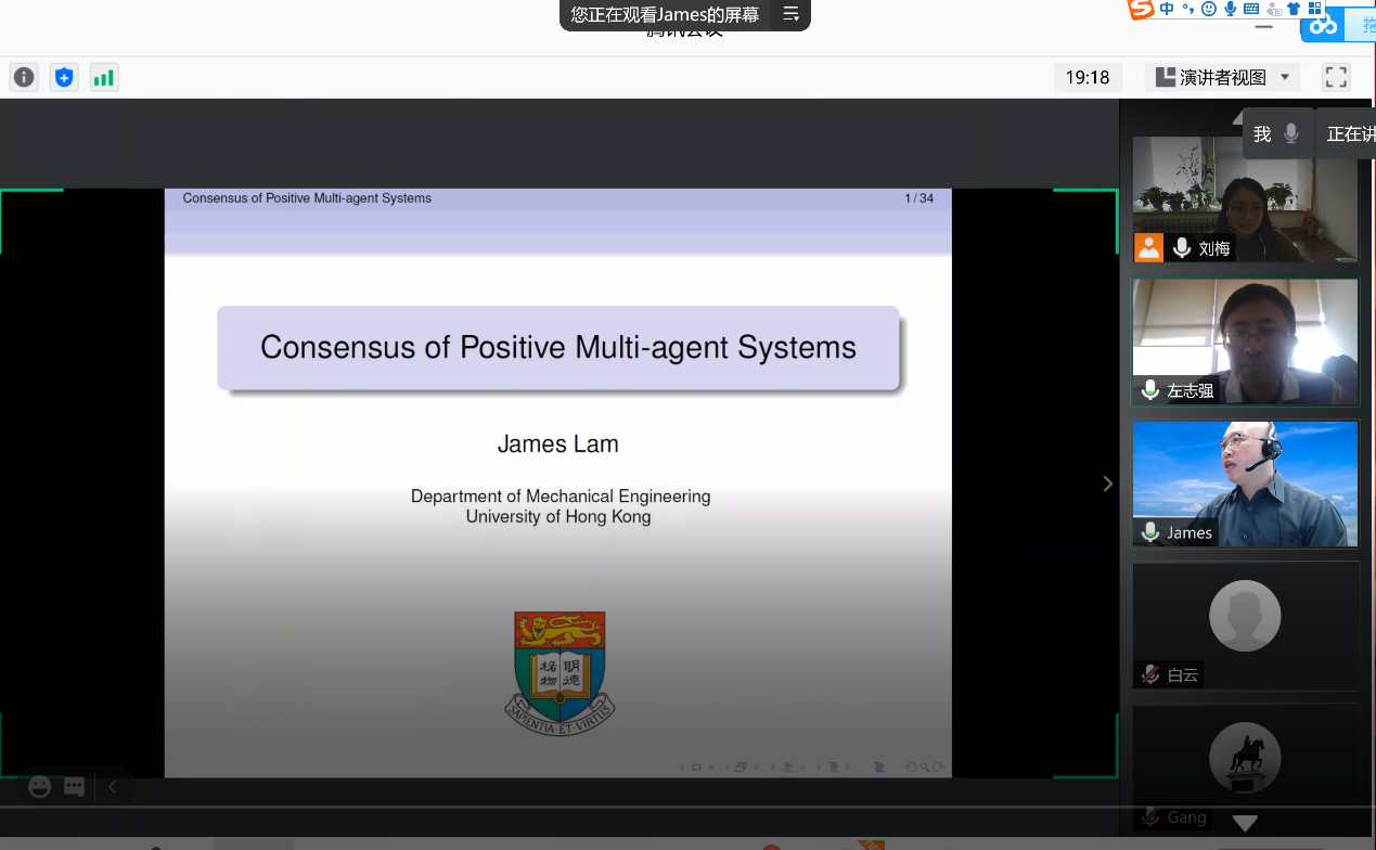 邀请,分别为学院师生线上做了题为“Consensus of Positive Multi-agent Systems”和“Hybrid Modelling and Control for Switched-Mode Power Converters”的学术报告。报告会由自动化系主任左志强教授主持,40余名师生聆听了报告.